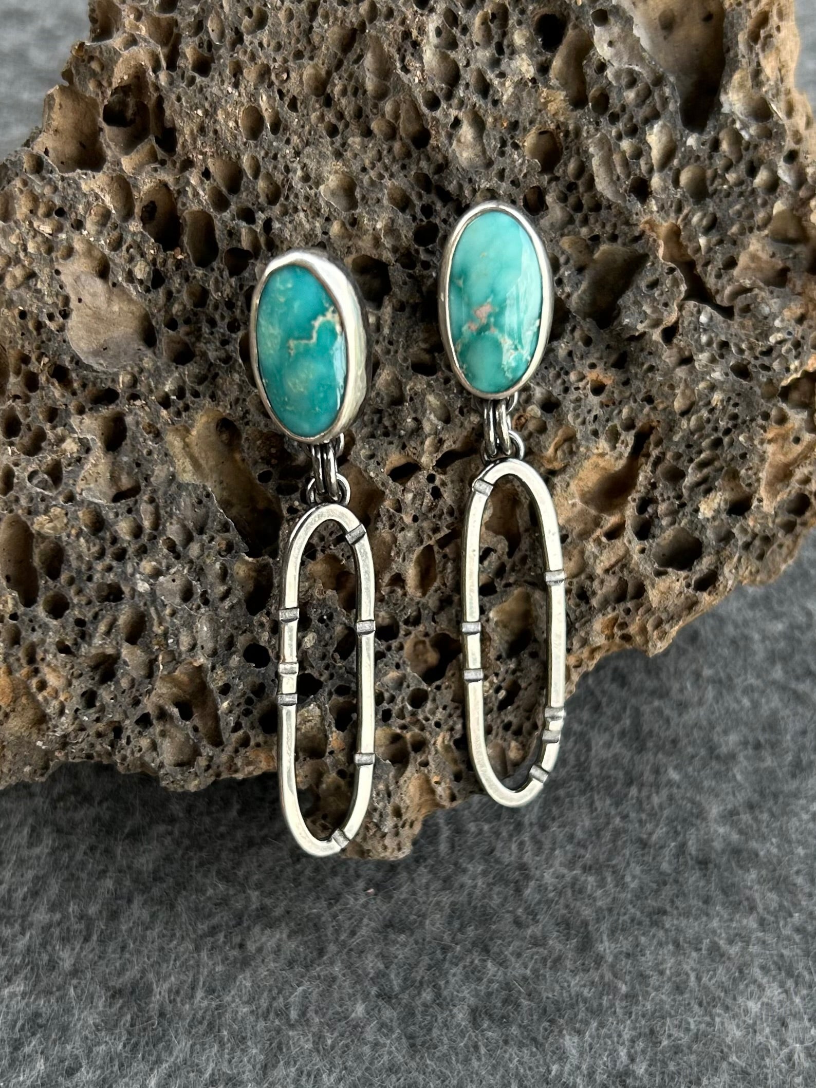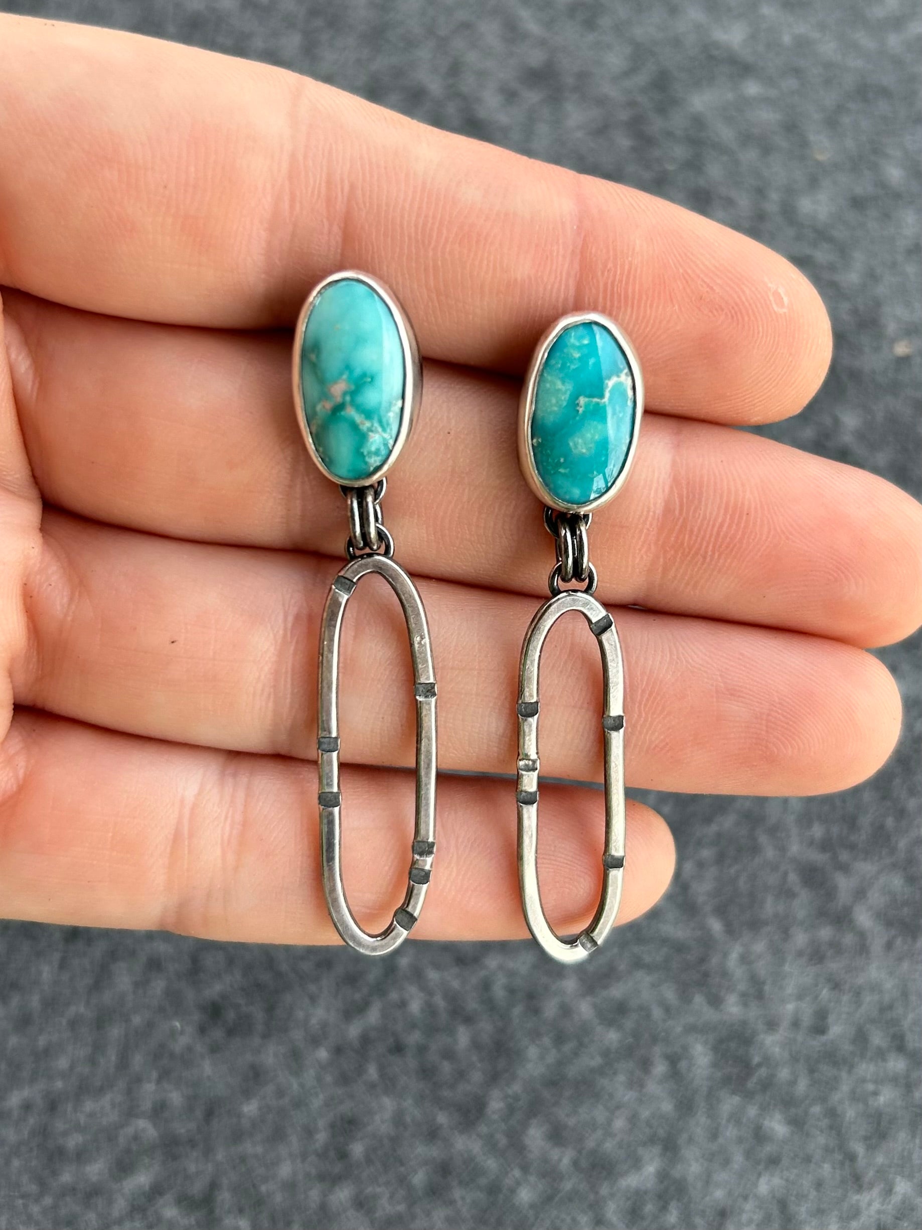 Sterling silver elongated hoops with hand-stamped details hang beautifully from gemstone stud earrings with bezel settings. These earrings are perfect for someone that wants unique earrings they can wear everyday. They have a modern-rustic vibe with a classic easy-to-wear shape. A few genuine Turquoise stones from the famous Whitewater mine in Campitos, Mexico, brings a pop of color to these light-weight hoops.